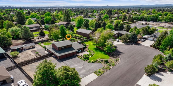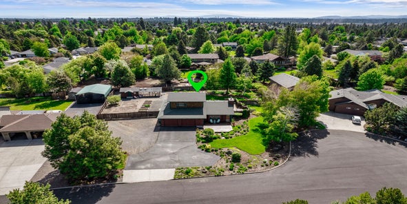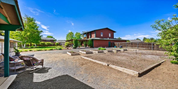 Welcome to Bend's sought-after SE neighborhood of Pleasant Ridge, where an extraordinary opportunity awaits. This remarkable property showcases an open floor plan that seamlessly integrates indoor & outdoor living spaces, ensuring a harmonious flow throughout, including its vaulted ceilings & abundant natural light. Step inside the great room, & you'll be captivated by the Chef's kitchen, featuring a spacious eat-in dining area, separate living area & a layout designed for both functionality & style. Positioned perfectly in the center of the expansive, buildable 0.53-acre lot, this house offers abundant space for future expansion or customization. The possibilities are endless, allowing you to tailor this property to your specific needs & desires. The majestic backyard, meticulously designed, invites you to step into a private sanctuary; this extraordinary garden, complete w seasonal low-maintenance plants, mature fruiting trees, level-lawns, greenhouse & storage shed will exceed your expectations.